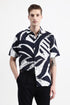 A white and black abstract print half-sleeve shirt crafted from a soft Viscose-Nylon blend, featuring a spread collar and classic button closure.