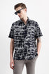 A white and black abstract print half-sleeve shirt crafted from a soft Viscose-Nylon blend, featuring a spread collar and classic button closure.